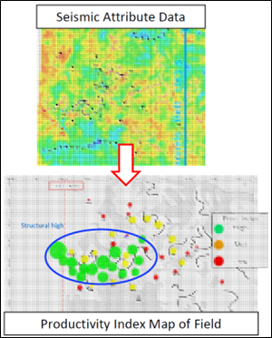 The analytical surveillance review also indicated a significant correlation between structural elements (crestal opening of fractures) and deposition patterns (east-west channelization), with well productivity. Our study enabled the targeting of future wells, through generation of an understanding of geological properties away from well control points by incorporating both geological attribute maps and traditional reservoir engineering maps.