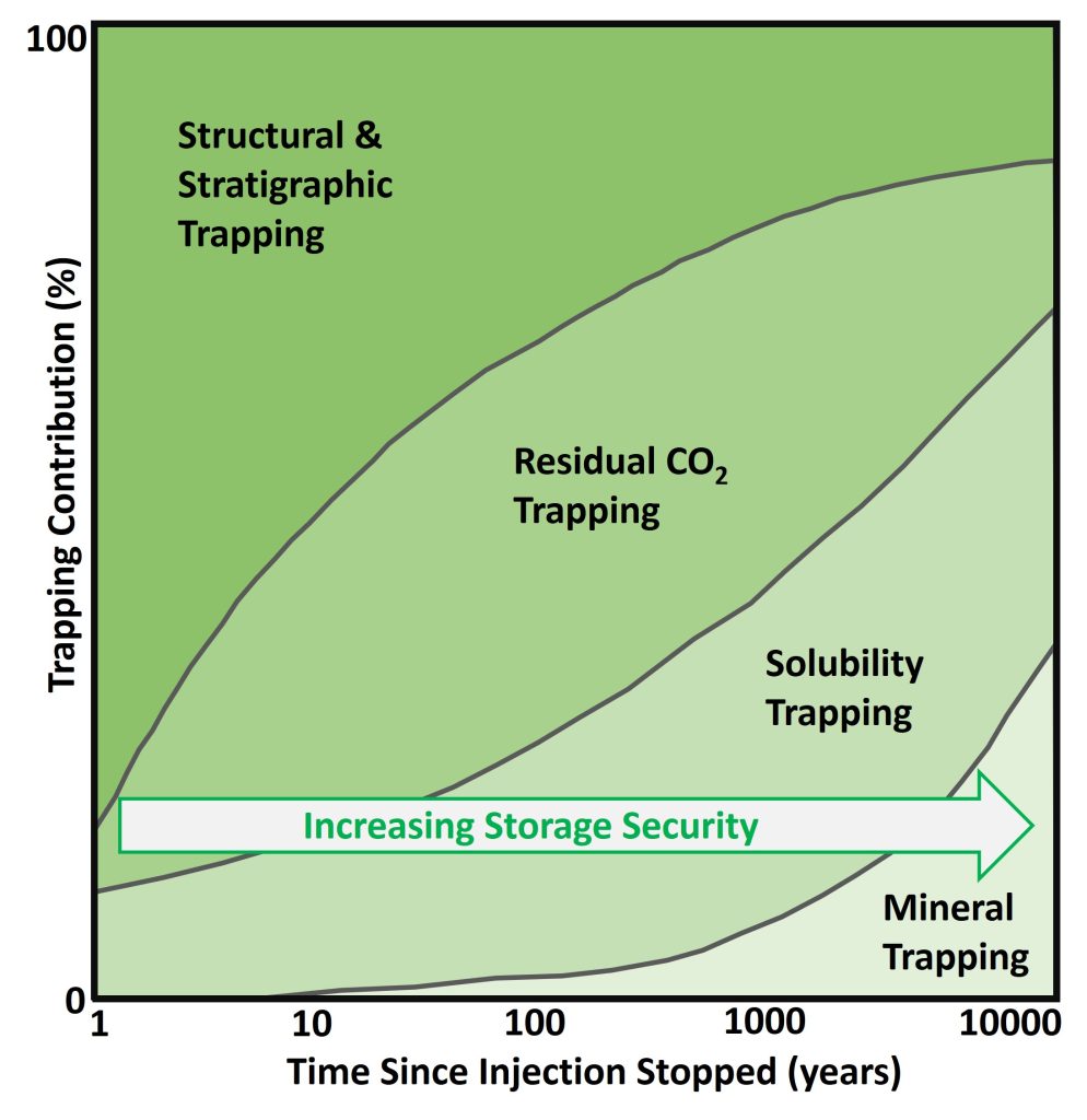 Given the period of time we are storing CO2 over, it is also important for us to understand how CO2 storage changes over time. The picture above shows three different types of trapping mechanisms (structural, residual and solubility), how much CO2 is trapped via each method, and how this varies over time. The trapping mechanism is important as it helps companies and their stakeholders understand the geological integrity of each storage site (ensuring the trapped gas does not seep to other unintended locations) prior to making final investment decisions.
